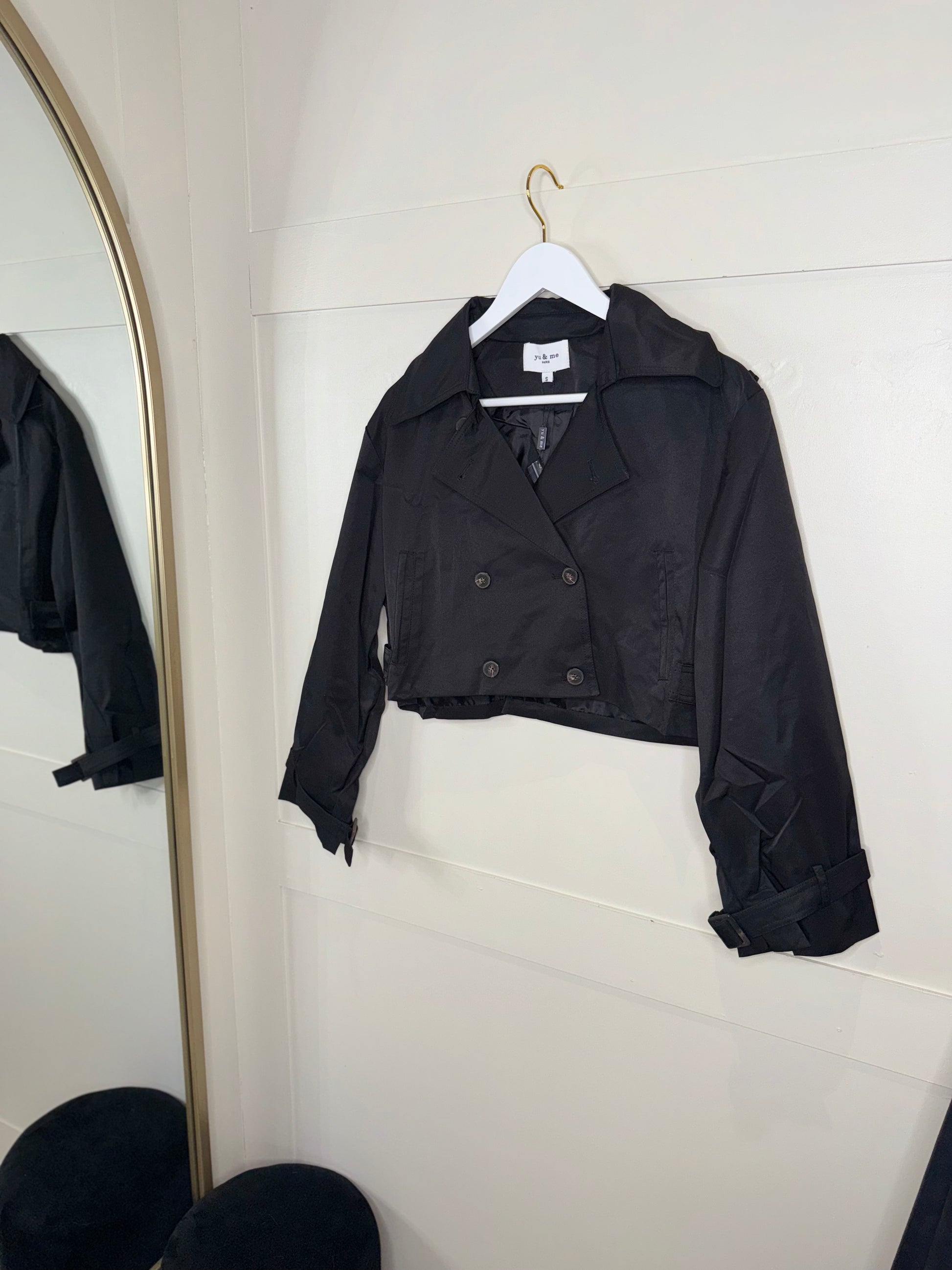 Oversized, boxy, cropped trench style jacket. Adjustable straps on each side to make the jacket slightly more fitted. Shower proof material. Black buttons. Double breasted.