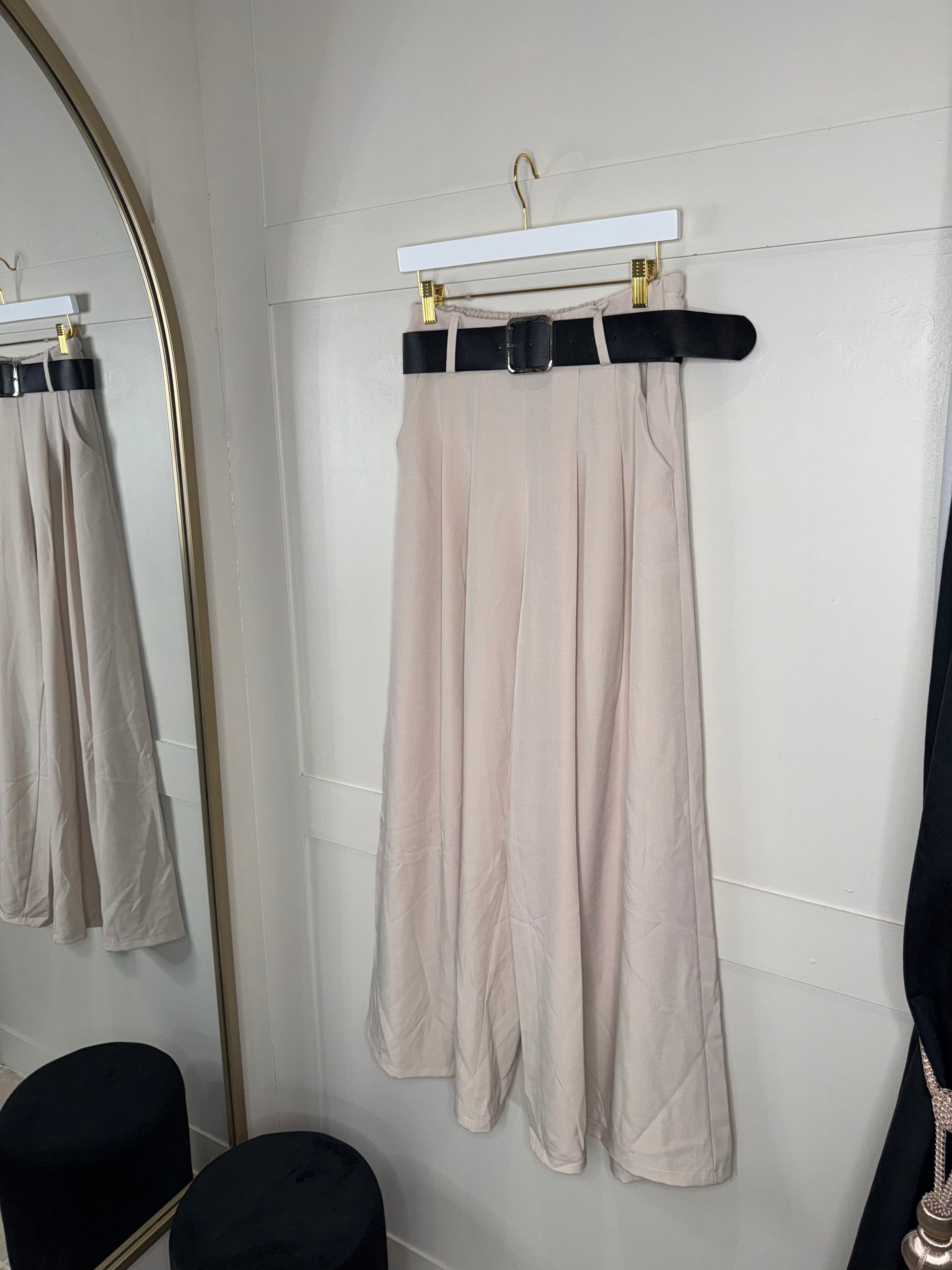 Extra wide leg trousers with belt. Belt is faux black leather with a silver buckle. Trousers are darted at the front and the waistband n elasticated at the front.