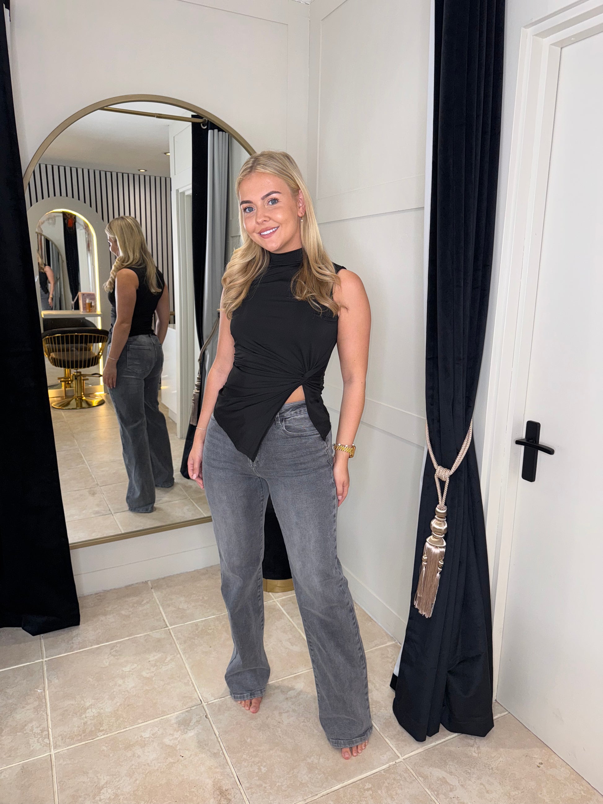 Wide leg, straight jeans in grey. Stretchy denim. Pockets at the front and back. Zip and button fastening.