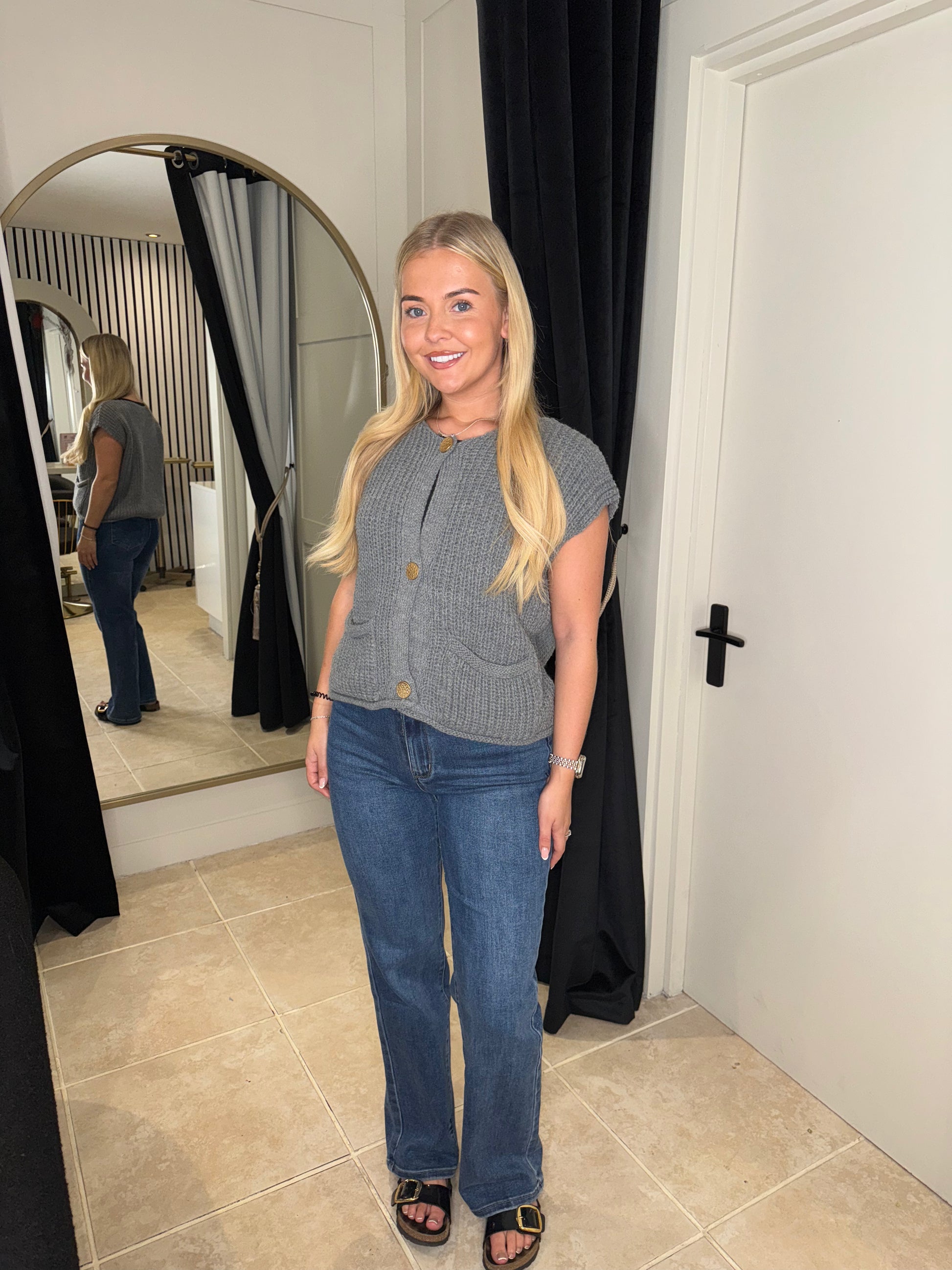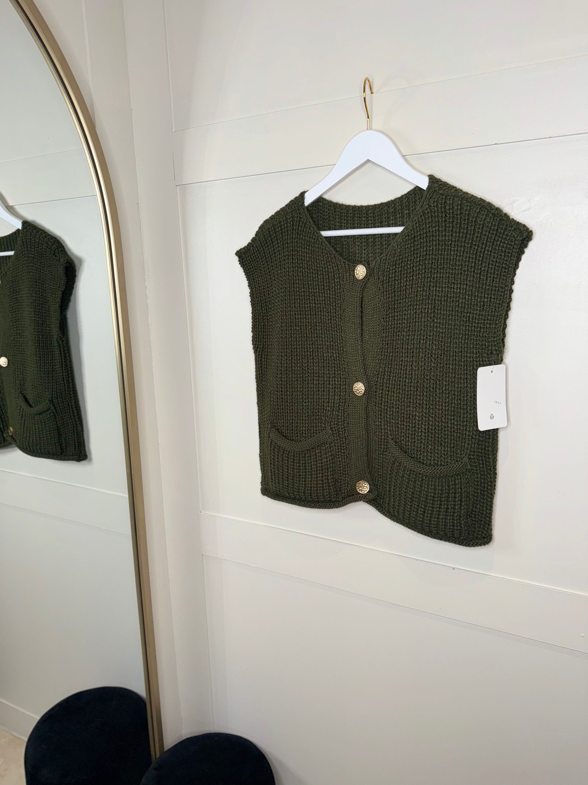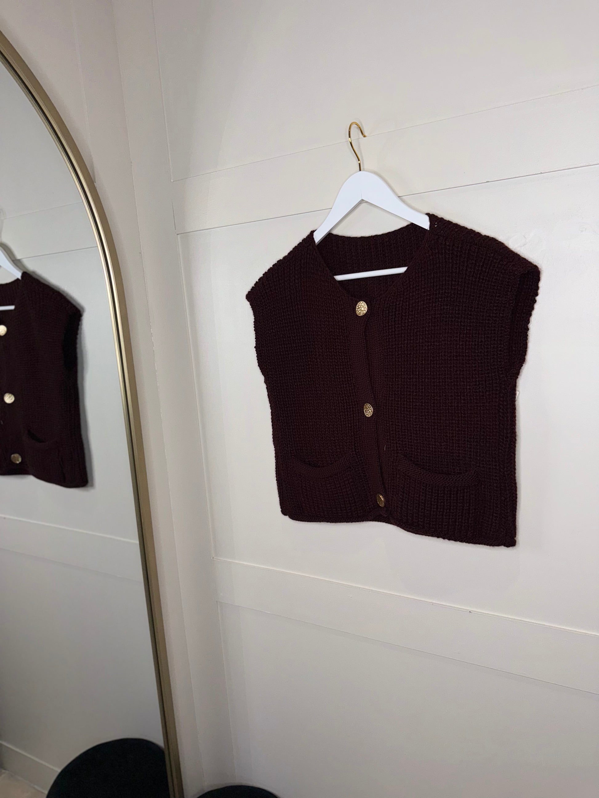 Chunky knit, sleeveless cardigan with gold buttons. Round neck. One size