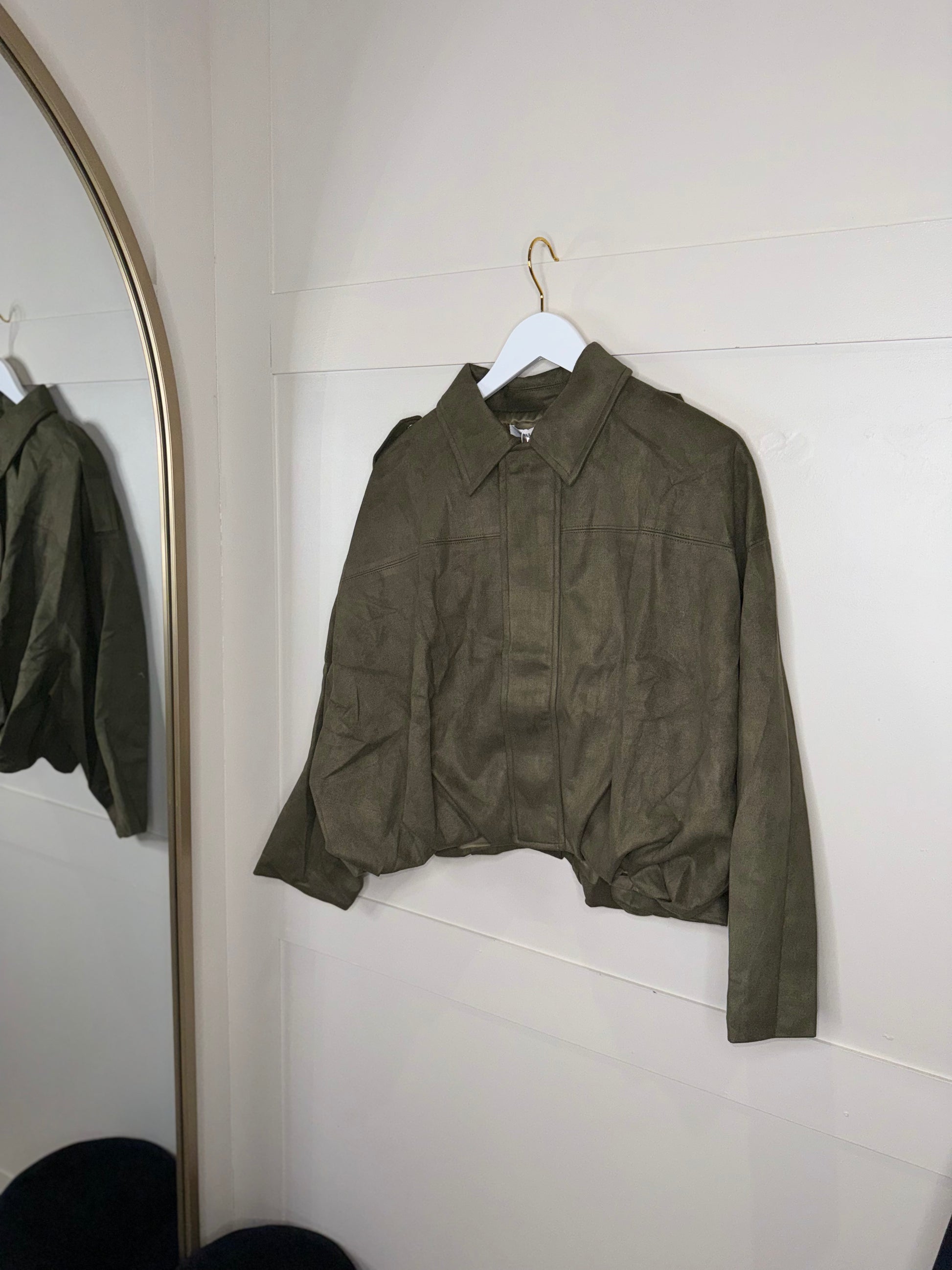 Oversized, faux suede jacket with collar. Jacket has zip and button fastening and button up lapels on the shoulders. Buttons and zip are silver.