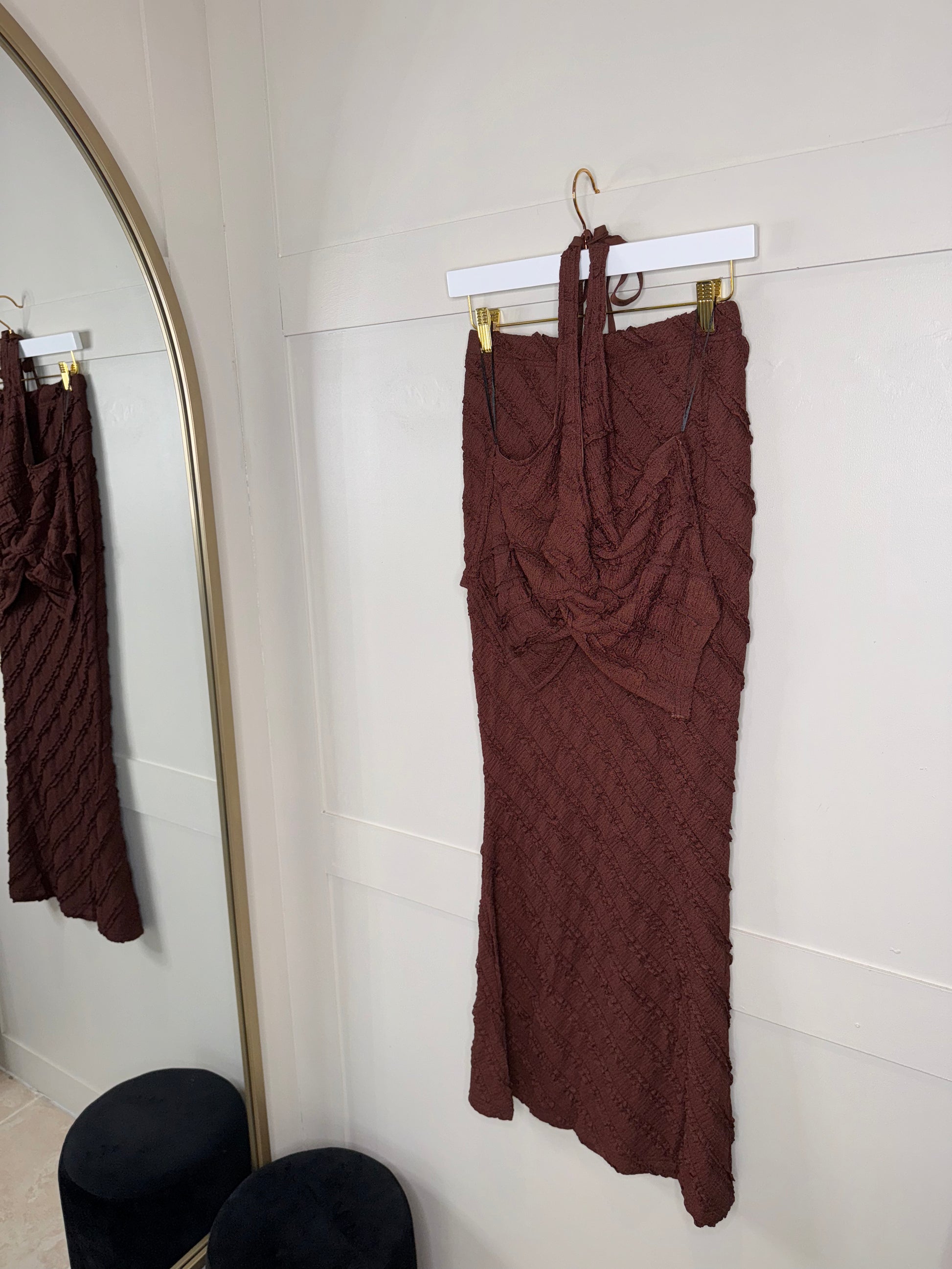Co ord set with halter neck, cropped top and maxi skirt. Skirt and top are lined so not see through. Skirt has an elasticated waistband and has a slight fishtail shape. The top ties up around the neck and has a plunge neckline with a twist effect at the front. The entire co ord has a ruffled lace effect within the material.