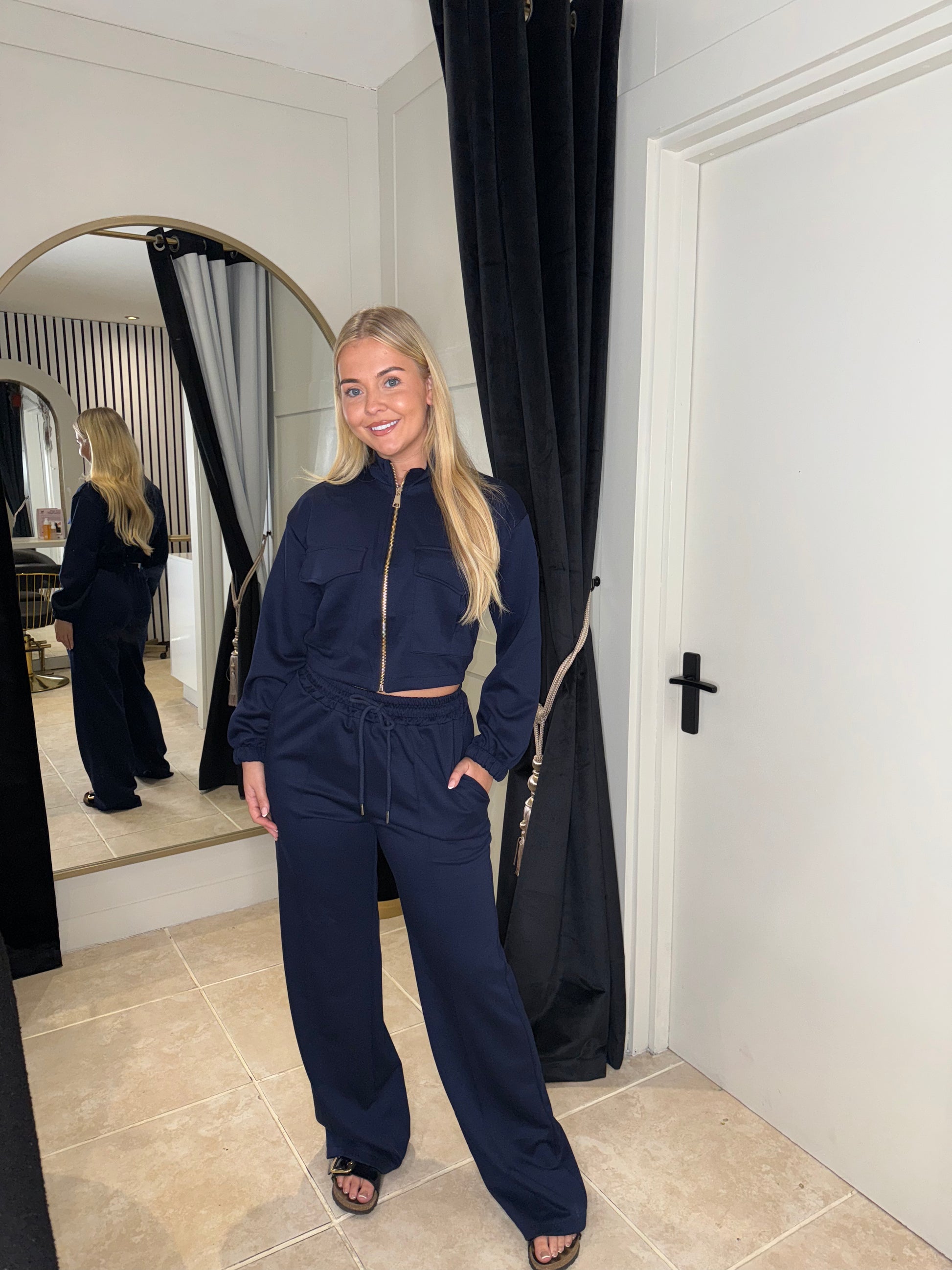 Tracksuit with high neck jacket and wide leg joggers. Joggers have an elasticated waist and a drawstring. They also have a seem down the front. Jacket is slightly cropped and has a gold zip. The jacket also has 2 'cargo style' pockets at the front. One size.